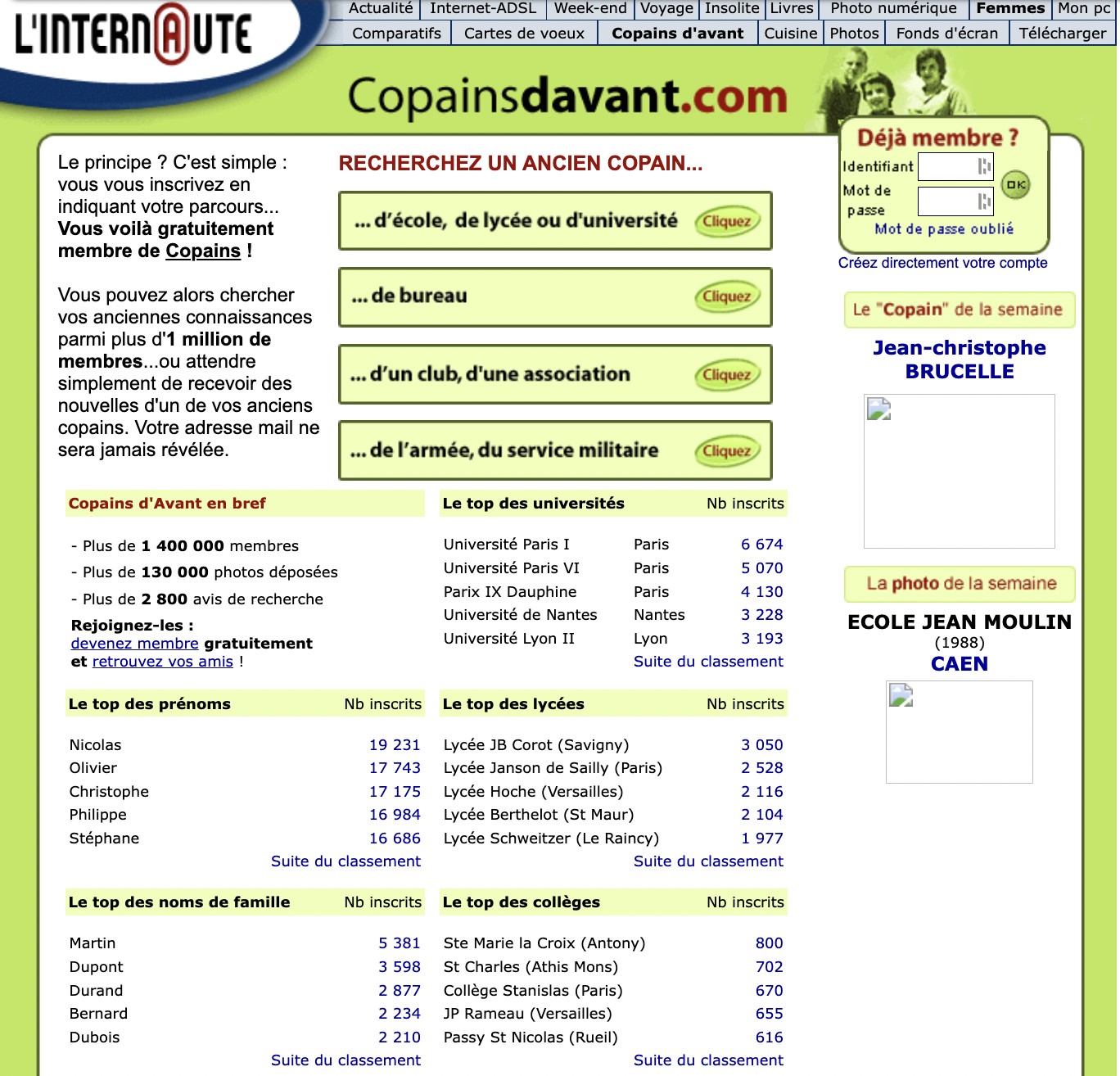 Créé en 2001, Copains d’avant permettait aux utilisateurs de retrouver d’anciens camarades de classe mais aussi les personnes rencontrées pendant des activités associatives ou professionnelles. À cette époque, vous pouviez déjà mettre des photos en ligne et envoyer des messages privés.