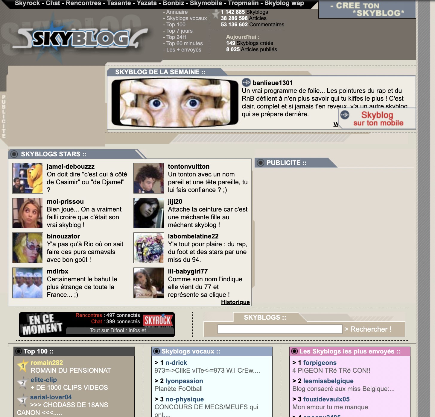 Le mur Facebook n’existait pas encore. Vous pouviez raconter votre vie sur des blogs. Les Skyblogs ont été lancés en décembre 2002. Le service, gratuit, ne nécessitait qu’une inscription à Skyrock.com et vous permettait de partager des textes, des photos mais aussi des vidéos.
