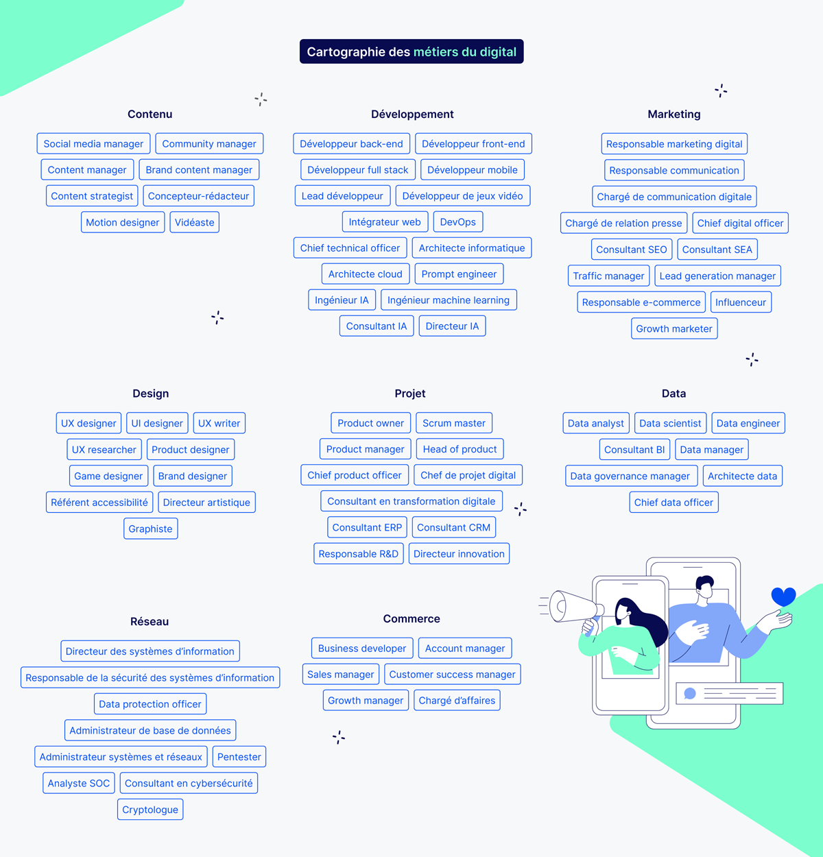 Pour vous guider dans cet écosystème aux multiples dimensions, nous vous proposons cette cartographie des métiers du digital 2026 (voir l’image ci-dessus), ainsi que le guide qui l’accompagne.