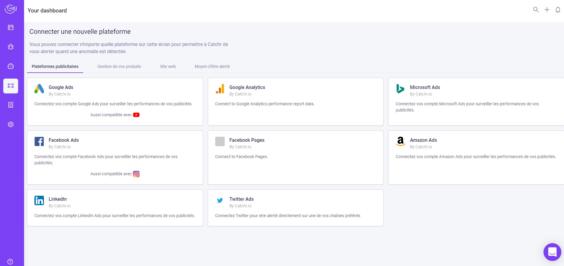 Les campagnes SEA peuvent concerner une multitude de canaux : Facebook Ads, Google, Amazon, Bing Ads… Il est évidemment compliqué de suivre en temps réel les performances de toutes ses campagnes et de toutes ses publicités. Catchr vous accompagne dans la gestion de l’ensemble de vos canaux digitaux à travers une plateforme simple d’utilisation. Elle vous permet de faire un monitoring complet de vos performances sur tous vos canaux d’acquisition, mais aussi de vous alerter en cas d’anomalie.