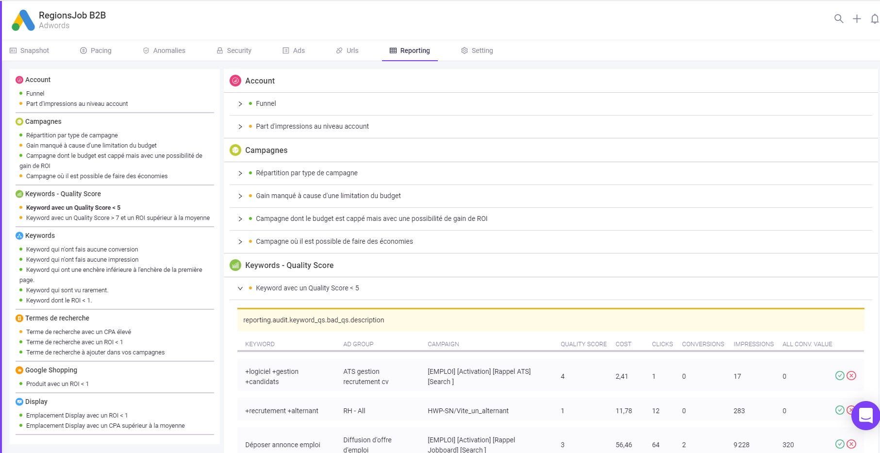 Vous pouvez à tout moment avoir une vue d’ensemble sur les performances, coûts, impressions, quality scores, etc. de vos différentes campagnes. Ces audits vous permettent de trouver comment optimiser vos comptes, et comment réduire vos dépenses d’acquisition, tout en évitant les erreurs.