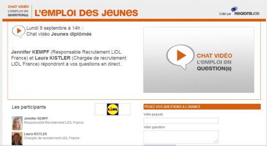 Pour aller encore plus loin, RegionsJob propose un chat vidéo sur le thème de l’emploi des jeunes le lundi 9 septembre à 14h. Pour l’occasion, Jennifer Kempf (Responsable Recrutement à LIDL France) et Laura Kistler (Chargée de recrutement à LIDL France) seront là pour répondre aux questions des participants. Elles en diront plus sur les recrutements prévus par Lidl cette année (en particulier pour les jeunes) et elles offriront des conseils pour bien chercher son premier emploi. Vous avez des questions ? Vous pouvez les poser dès maintenant ! Pour cela, plusieurs solutions s’offrent à vous :