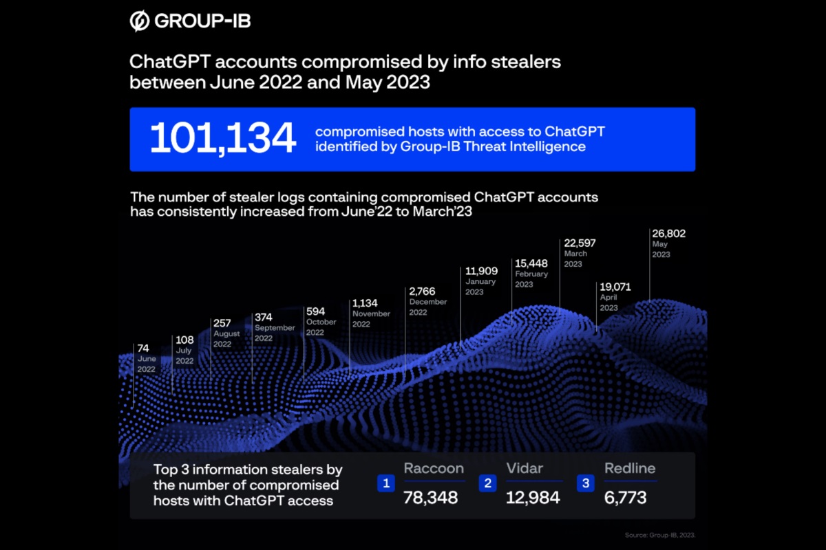 Dans un communiqué publié sur son site, Group-IB, entreprise spécialisée dans la cybersécurité, a révélé avoir détecté 101 134 comptes OpenAI compromis et mis en vente sur le dark web sur la période juin 2022 – mai 2023. Selon le groupe, le nombre de piratages a atteint un pic durant le mois de mai 2023, avec 26 802 comptes affectés (voir image à la une).