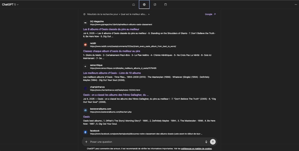 Lorsqu’une requête est déclenchée, l’utilisateur est automatiquement redirigé vers l’onglet Accueil, dont l’interface reprend globalement celle de ChatGPT. L’assistant y affiche sa réponse, avec des liens cliquables en haut de page et dans le corps du texte, qui permettent d’approfondir le sujet. Selon la nature de la requête, la réponse peut être enrichie par des images d’illustration.