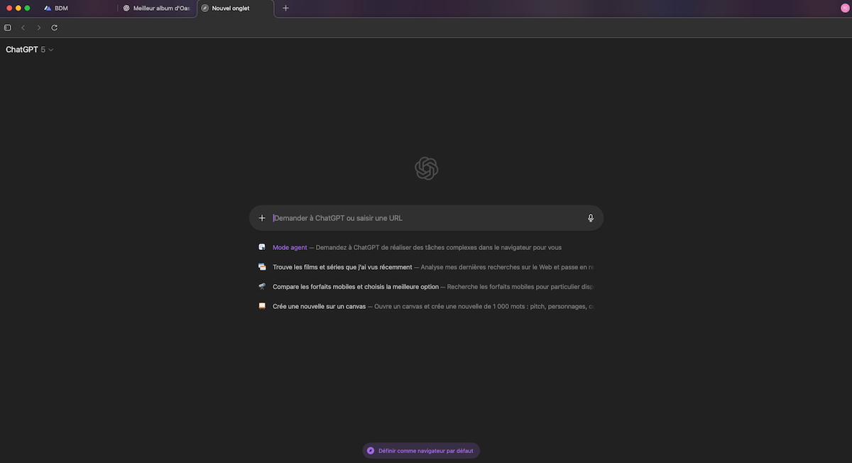 Avec ChatGPT Atlas, OpenAI a opté pour une approche résolument minimaliste. L’interface reprend les codes des navigateurs web les plus plébiscités du marché, comme Chrome ou Firefox : une barre de favoris, une barre des tâches donnant accès aux marque-pages, aux onglets ou aux paramètres, ainsi qu’une page d’accueil uniquement composée d’une barre centrale, où l’on peut interroger ChatGPT ou saisir directement une URL. Il est également possible de modifier le modèle répondant aux requêtes, comme sur ChatGPT, en cliquant sur le bouton ChatGPT 5 situé en haut à gauche de l’écran. Un bouton en bas de page permet, en outre, de configurer ChatGPT Atlas comme navigateur par défaut, si ça n’a pas été fait lors de la phase de configuration initiale.
