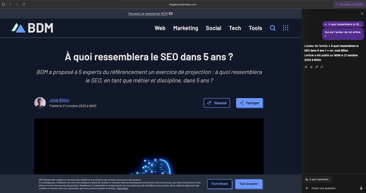 Lorsque vous consultez un site web, un bouton Demander à ChatGPT apparaît dans le coin supérieur droit. Il ouvre un panneau latéral donnant accès à l’assistant, qui peut alors effectuer différentes actions, comme résumer les principaux thèmes de la page ou en expliquer le contenu.