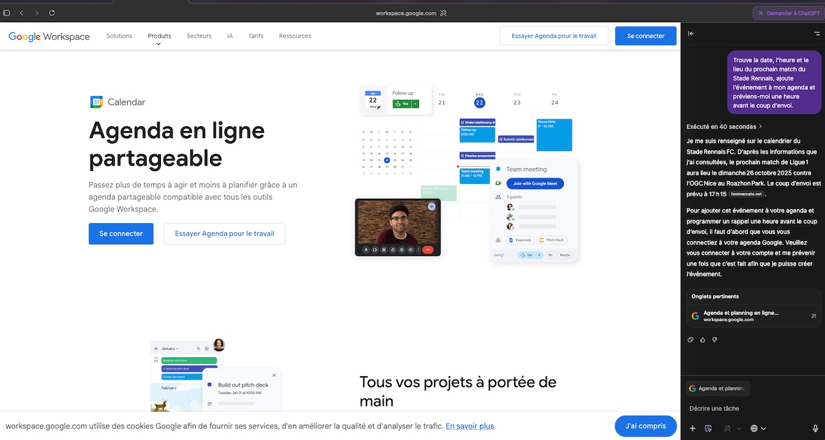 Pour l’instant réservé aux utilisateurs payants, l’agent ChatGPT, dévoilé en juillet et encore en phase expérimentale, est capable d’exécuter différentes tâches à votre place. Activable depuis la barre de saisie de la page d’accueil, il peut, par exemple, rechercher des informations sur une activité, l’ajouter à votre agenda et programmer un rappel, comme dans l’exemple ci-dessous. Pour des raisons de sécurité, il ne peut néanmoins pas exécuter toutes les tâches, d’après OpenAI. Il sera, par exemple, incapable d’exécuter du code dans le navigateur, d’installer des extensions, de télécharger des fichiers ou d’accéder à d’autres applications sur votre ordinateur.
