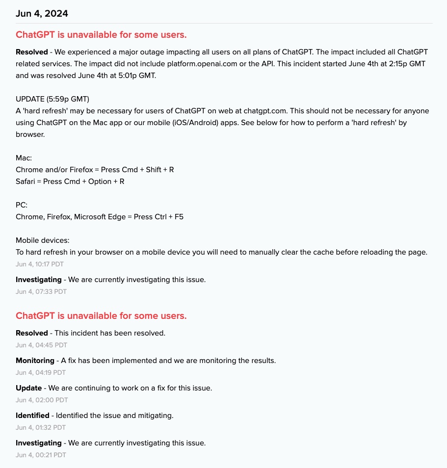 Mardi 4 juin, dans le courant de l’après-midi, il était impossible d’envoyer un message à ChatGPT. Le chatbot d’OpenAI a connu une série de pannes, qui n’ont été résolues qu’en fin de journée, alors que l’agent conversationnel n’était disponible que par intermittence, voire pas du tout pour certains utilisateurs. Sur sa page renseignant le statut de ses services, OpenAI faisait en effet part d’une « panne majeure ». Celle-ci aurait duré environ 5h30 au total, selon les informations du rapport d’incident.