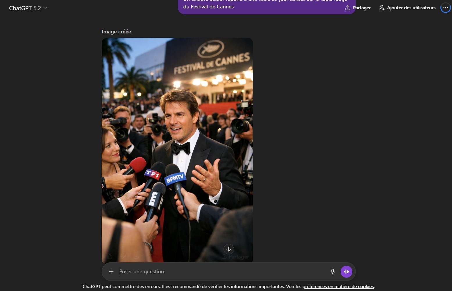 Nous avons donc essayé le prompt suivant : « Un célèbre acteur répond à une foule de journalistes sur le tapis rouge du Festival de Cannes ». Le temps de génération est plus court que celui du précédent générateur, mais reste relativement long. L’image générée est de meilleure qualité : elle semble plus naturelle et n’affiche plus le filtre jauni de la précédente version. En revanche, quelques malformations persistent, notamment au niveau des micros des journalistes. Autre cocasserie : ChatGPT a manifestement généré un sosie de Tom Cruise.