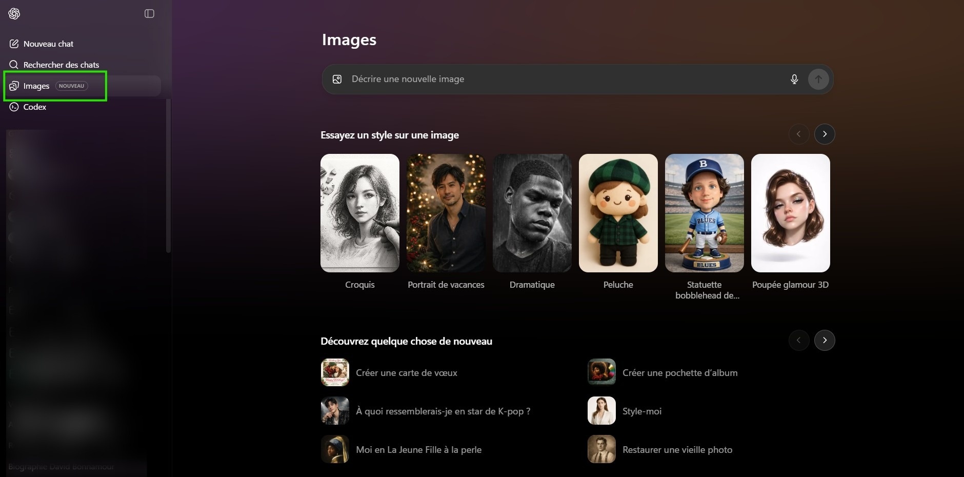 L’arrivée de ce modèle s’accompagne d’une nouvelle section dans ChatGPT. Elle s’intitule sobrement « Images » et se situe dans le menu latéral, juste sous la recherche de chats. Vous y trouverez vos images, ainsi que des suggestions de styles et de formats. En haut, vous trouverez la barre de prompts.