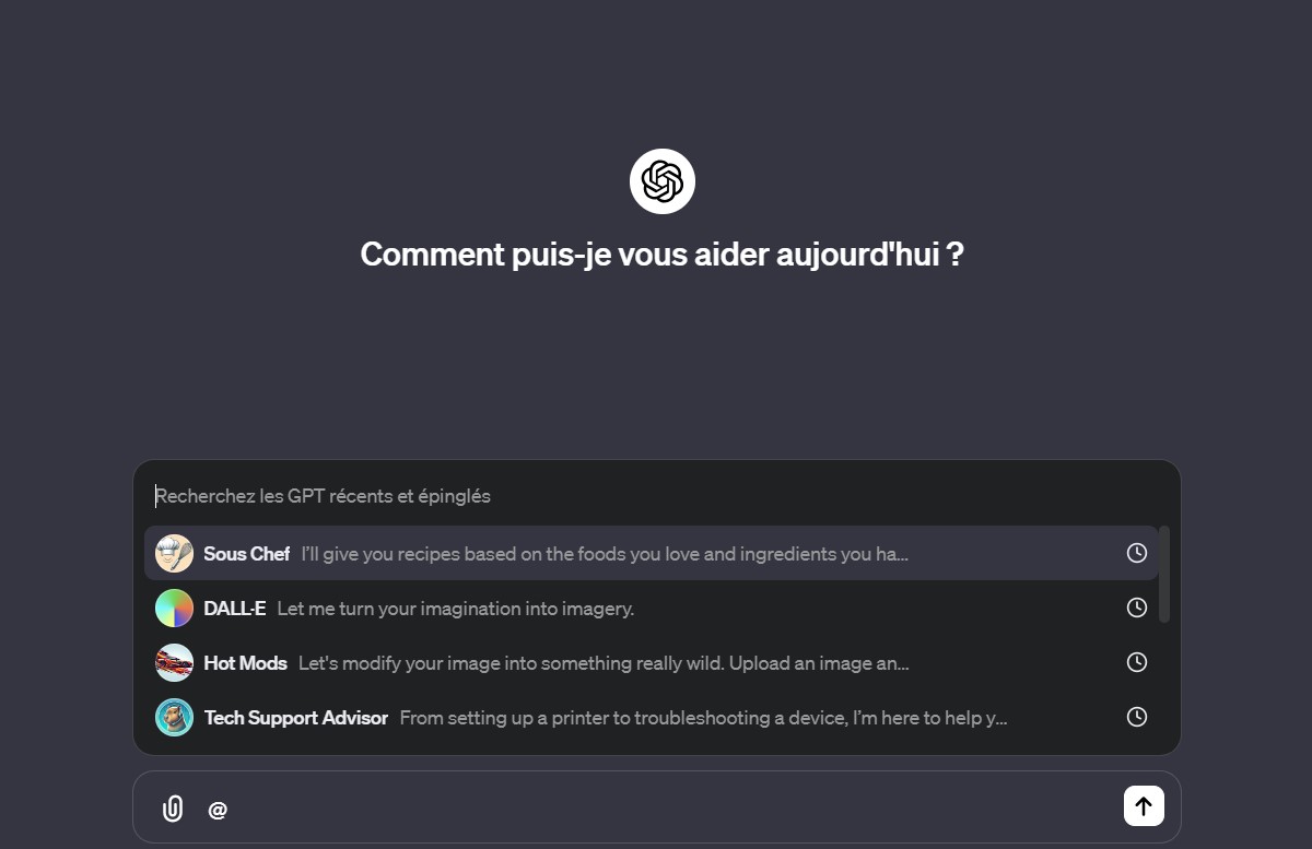 Puis, si vous discutez comme à votre habitude avec ChatGPT, vous pouvez à tout moment faire appel à un GPT personnalisé dans la conversation. Pour cela, en tapant un « @ » dans la boîte de discussion, un menu déroulant s’ouvrira, vous proposant plusieurs GPTs récemment utilisés. Choisissez celui qui vous convient, posez-lui votre question et il y répondra à la suite de votre conversation initiale, dont il comprendra le contexte.