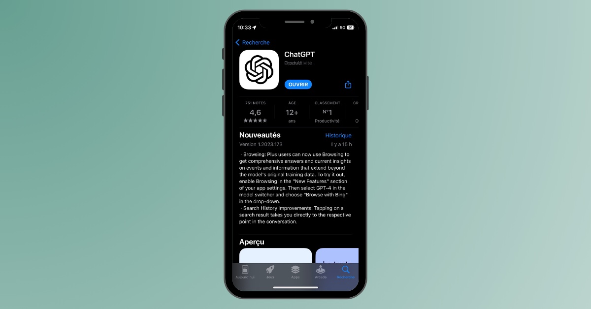 Dans une note de mise à jour, OpenAI annonce le déploiement de la version 1.2023.173 de l’application iOS, disponible sur l’Apple Store depuis plusieurs semaines. La principale nouveauté concerne les souscripteurs de ChatGPT Plus – l’offre premium de l’agent conversationnel. Désormais, ils peuvent utiliser Browsing : un plugin capable de chercher des informations actualisées sur le web via Bing, son moteur de recherche par défaut.