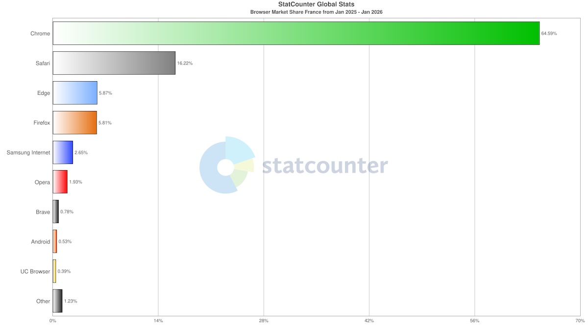 - Sur l’ensemble de l’année 2025, Safari est le deuxième navigateur web le plus utilisé en France derrière Google Chrome, avec 16,22 % de part de marché,