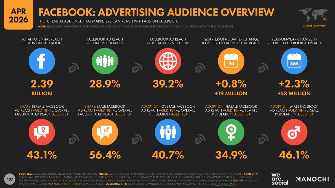 Sur la base des usages déclarés, Facebook reste la plateforme sociale la plus utilisée au monde, avec 56,3 % des internautes âgés de 16 ans et plus indiquant l’avoir utilisée au cours du dernier trimestre mesuré, un taux stable depuis deux ans. YouTube se classe en deuxième position avec 55,3 %, suivi d’Instagram avec 54,6 % et WhatsApp avec 54,4 %. À noter que la portée publicitaire de Facebook s’élève à 2,39 milliards de personnes, en hausse de 2,3 % sur un an.