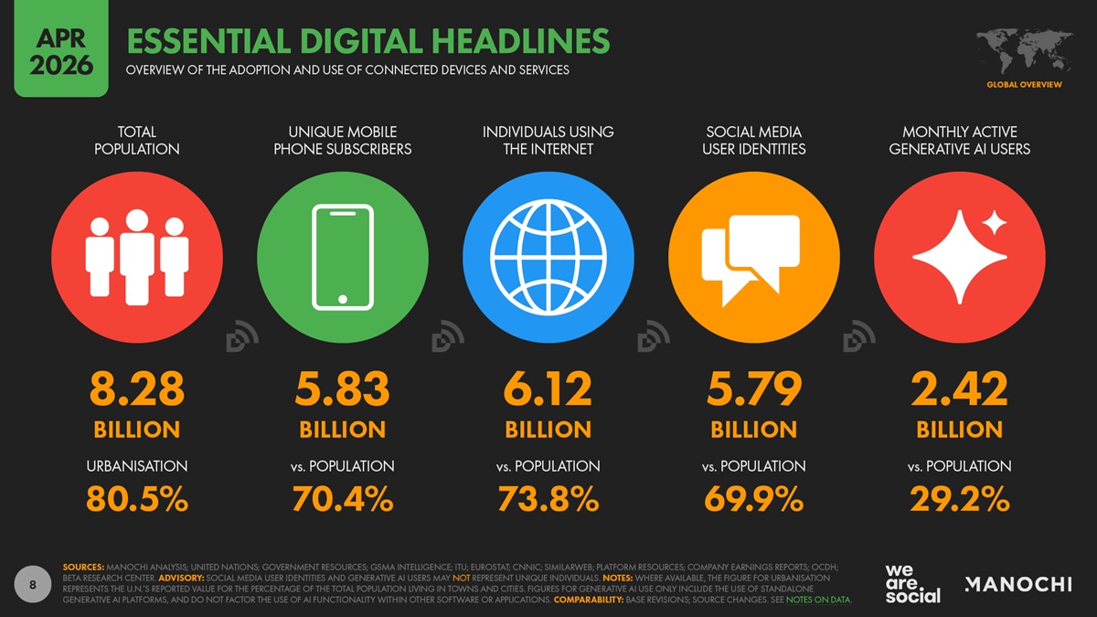 Un chiffre domine cette édition du Digital Report d’avril 2026 : 2,42 milliards de personnes dans le monde utilisent désormais des plateformes d’IA générative, telles que ChatGPT, Gemini ou Doubao (développée par ByteDance, la maison-mère de TikTok), soit plus du double par rapport à avril 2025.