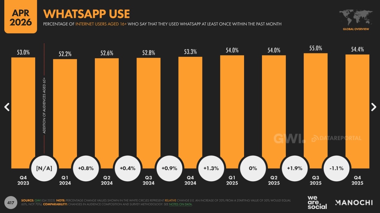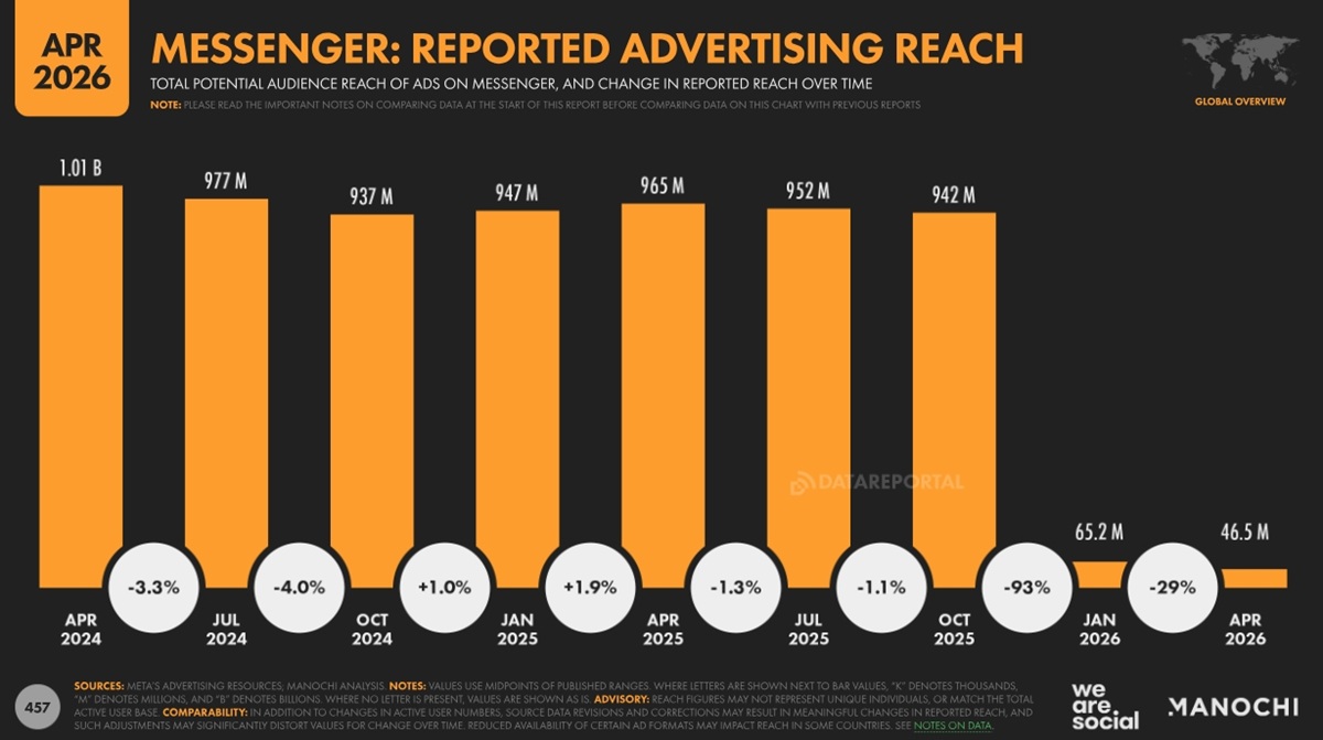 Au sein de l’écosystème Meta, le rapport signale un basculement notable entre ses deux applications de messagerie. Depuis novembre 2025, Meta a mis fin au placement publicitaire dans la boîte de réception de Messenger, entraînant une chute de 95,2 % de sa portée publicitaire sur un an, soit une perte de 918 millions de personnes. La portée publicitaire de Messenger s’établit désormais à 46,5 millions de personnes en avril 2026, contre 942 millions juste avant cette décision. L’usage de la plateforme est également en recul, avec une baisse de 10 % de l’usage déclaré sur deux ans, à 36,9 % des adultes en ligne.