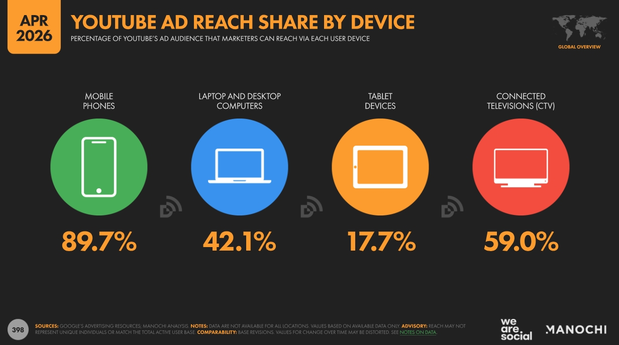 Le rapport met également en lumière la montée en puissance de YouTube sur les télévisions connectées : 59 % de son audience publicitaire est désormais accessible via ce support, qui s’impose comme le deuxième écran de la plateforme derrière le mobile (89,7 %).