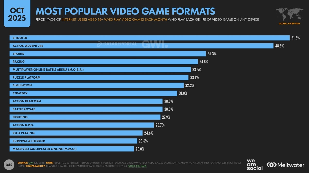 - Le shooter est le genre le plus plébiscité au niveau mondial, étant pratiqué par 51,8 % des joueurs chaque mois. Il devance les titres d’action-aventure (48,8 %) et les jeux de sport (36,3 %),