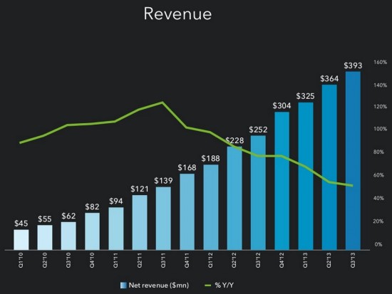 De son côté, le chiffre d’affaire ne cesse d’augmenter : il a atteint 393 millions de dollars au troisième trimestre 2013, contre 364 millions sur la période précédente (+8%). Sur un an, la croissance du CA s’établit à 56%. La tendance est à la « baisse de la hausse », mais la croissance des revenus nets reste très confortable.