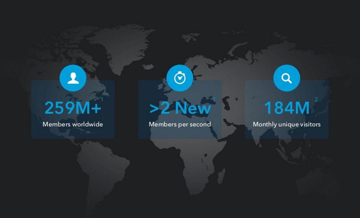259 millions de personnes sont inscrites sur LinkedIn. Mais le réseau social professionnel n’indique pas combien d’utilisateurs s’y retrouvent chaque mois, il est donc difficile de comparer ce chiffre avec ceux fournis par Facebook, Google+ et les autres. La croissance reste inchangée à 2 nouveaux membres par seconde. LinkedIn a gagné 8,8% d’utilisateurs en trois mois et 38,5% en un an.