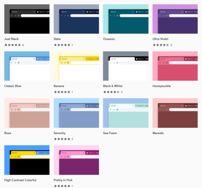 En tout, 14 designs sont disponibles directement depuis le store Google Chrome et peuvent s’installer en un clic. Les thèmes adoptent tous un style de couleur particulier, allant du plus sombre aux tons les plus clairs et pastel, en passant par des combinaisons vives de couleurs contrastées.