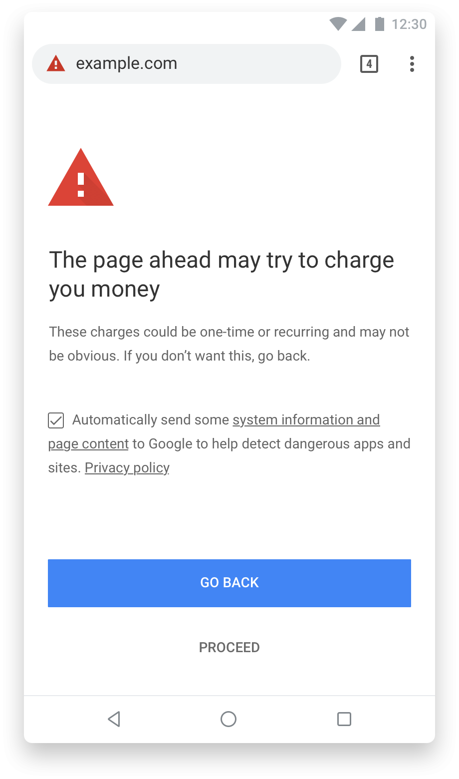 Google veut s’assurer que les utilisateurs de Chrome comprennent quand ils passent par un flux de facturation, et s’assurent qu’ils seront en mesure de prendre des décisions éclairées lors de leur navigation sur le web. Pour informer les utilisateurs de façon adéquate, il est important de fournir un niveau suffisant de détails dans la page de facturation, comme indiqué dans cette page d’information sur les frais de facturation mobile. Les pages qui répondent positivement aux questions suivantes fournissent généralement suffisamment d’informations aux utilisateurs :