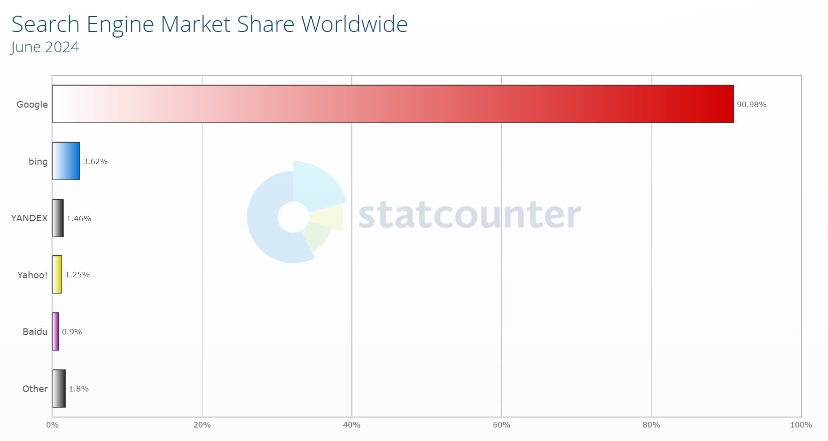 Le marché mondial des moteurs de recherche constitue un quasi-monopole, tant Google domine ses concurrents. Tous supports confondus, plus de 9 utilisateurs sur 10 optent pour le moteur de recherche fondé en 1998. Sa domination est encore plus marquée sur mobile, où Google parvient à capter 94,95 % des parts de marché.