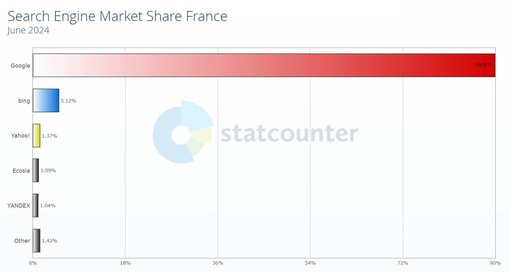 En France, la domination de Google est à peine plus faible. Le géant du web accapare 89,95 % des parts de marché, tous supports confondus. S’il reste incontesté, Google recule tout de même légèrement d’année en année. Il y a cinq ans, à la même période, sa part de marché atteignait 94,2 %. Sur desktop, Bing parvient à capter 13,75 % des parts de marché, soit une augmentation de 10 % par rapport à il y a cinq ans.