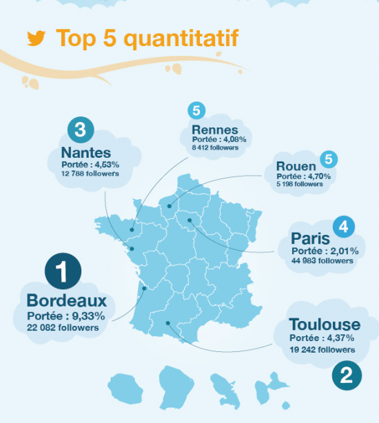 Adverbia dresse un « classement quantitatif » des villes selon leur nombre de followers et leur portée (abonnés par rapport au nombre d’habitants). Et surprise, ce n’est pas Paris qui tient la tête mais Bordeaux suivi de Toulouse et de Nantes. Paris se classe seulement 4ème.