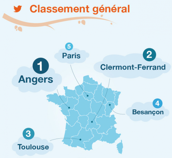 Angers, Clermont-Ferrand et Toulouse occupent le top 3, talonnés par Besançon et Paris. Ces 5 villes illustrent bien les bonnes pratiques à suivre en matière de community management publique.