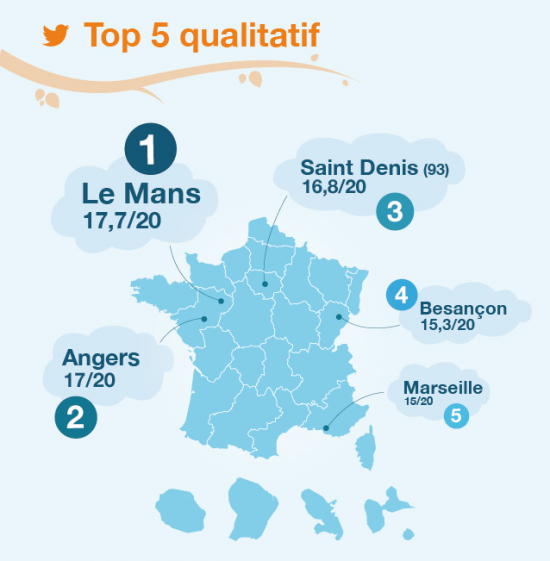 Si le classement quantitatif est un paramètre important, Adverbia s’est attelé à créer une grille d’analyse plus complexe afin d’obtenir un classement qualitatif. Les métriques appliquées sont beaucoup plus poussées : automatisation ou non du flux, qualité des échanges avec les followers, ratio following / followers, fréquence des tweets, nombre de RT… Bref, une analyse très fine de la qualité du compte et de ses tweets. Et dans ce classement qualitatif, ce sont les « petites » villes qui font bonne figure : Le Mans arrive en tête, suivi d’Angers, Saint-Denis, Besançon et Marseille.