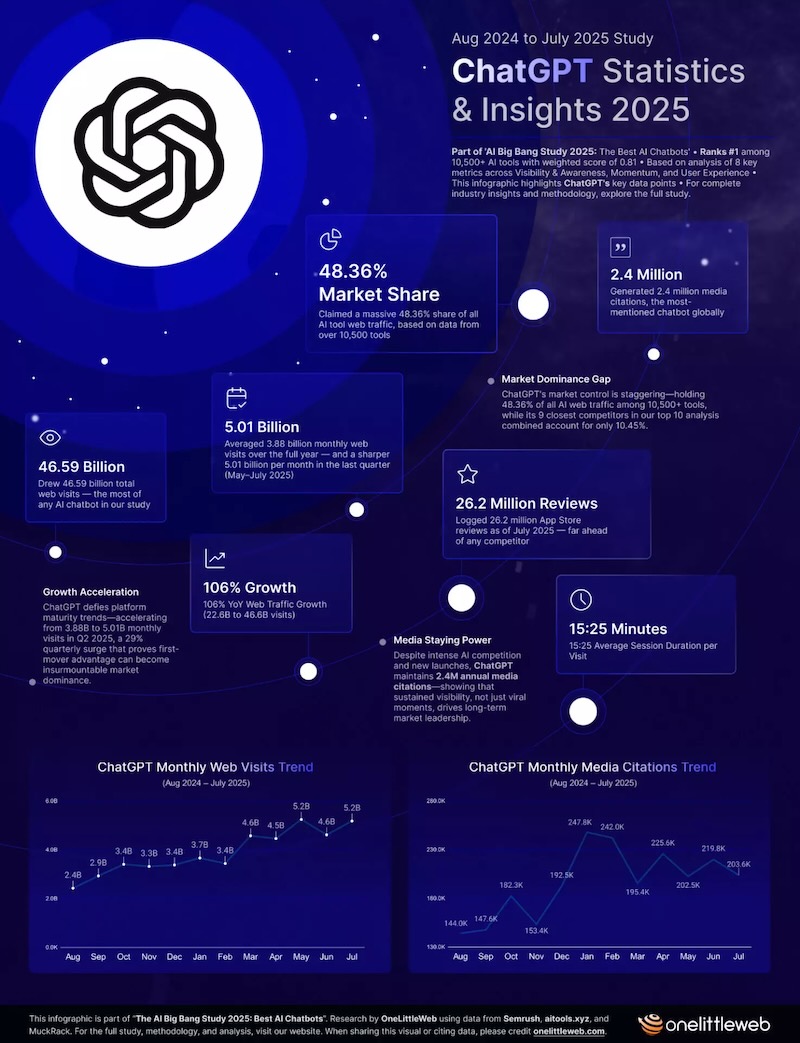 Mettons immédiatement fin au (très relatif) suspense : même au sommet, ChatGPT continue de croître à vive allure et à reléguer très loin ses rivaux. « ChatGPT n’est pas seulement un nom connu de tous, il est devenu une habitude », estime OneLittleWeb, qui l’explique par son intégration profonde à l’écosystème d’OpenAI et à certains des produits Microsoft. Les chiffres parlent d’eux-mêmes : sur la période étudiée, ChatGPT totalise plus de 46,5 milliards de visites, loin devant DeepSeek (2,7 milliards) son plus proche poursuivant. Rien qu’au dernier semestre, de mai à juillet 2025, il a attiré chaque mois 5,01 milliards d’utilisateurs, un record historique.