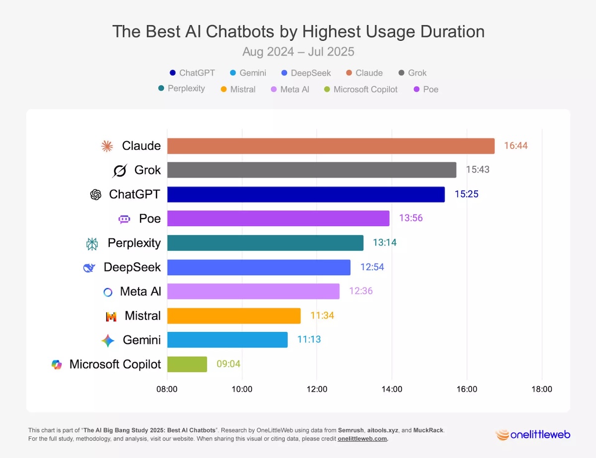 La principale faiblesse de Gemini fait la force de Claude : avec Grok, ce sont les seuls à surpasser en temps passé par l’utilisateur. Avec 16 minutes et 44 secondes de moyenne par session, Claude, reconnu pour ses fonctionnalités originales comme les Artefacts, s’impose comme le roi de la rétention. Sans pour autant exploser les compteurs : il ne totalise « que » 1,15 milliard de visites entre août et juillet 2025, a été cité un million de fois dans les médias, et ne comptabilise que 118 000 avis sur les App Stores. Mais selon OneLittleWeb, ses atouts devraient lui permettre de se faire durablement une place dans l’écosystème : « La trajectoire de croissance de Claude illustre une montée en puissance stable, portée par le bouche-à-oreille et la satisfaction des utilisateurs plutôt que par le marketing viral. »