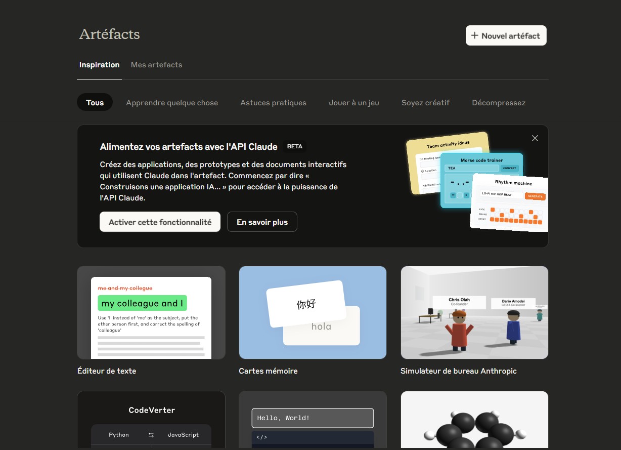 La mise à jour s’accompagne d’un nouvel espace uniquement destiné aux artefacts. Celui-ci, accessible aux utilisateurs des plans Free, Pro et Max, se trouve dans le menu à gauche de l’interface et permet de retrouver l’ensemble de vos projets ou d’en créer un nouveau. Pour ce faire, vous pouvez appuyer sur Nouvel artefact, en haut à droite. Pour créer des applications intégrant des capacités d’IA grâce à l’API de Claude, pensez également à appuyer sur Activer la fonctionnalité, au centre de l’interface.