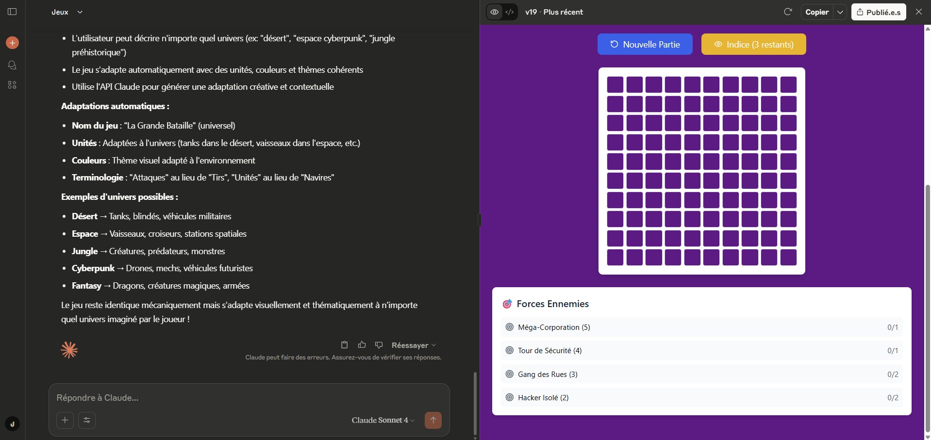 Mais nous décidons d’aller plus loin, en intégrant encore davantage d’interactivité. Notre jeu s’appellera désormais La Grande Bataille. Elle se déroulera dans l’univers souhaité par l’utilisateur, qu’il peut définir via une requête textuelle. Après avoir lui-même produit 19 versions, Claude accède à notre demande. Ainsi, dans la barre « Changer d’Univers », lorsque nous entrons « Espace », nous nous retrouvons à devoir éliminer des croiseurs galactiques et destroyers stellaires au lieu des traditionnels porte-avions et sous-marins. En revanche, contrairement à ce qu’indique Claude — qui affirme que « le jeu reste identique mécaniquement, mais s’adapte visuellement et thématiquement à n’importe quel univers imaginé par le joueur » —, le nombre d’univers reste limité. Certains ne donnent lieu à aucune adaptation.