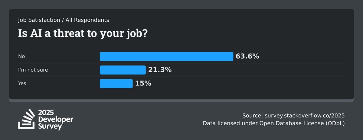 Tous pays confondus, les développeurs semblent globalement satisfaits de leurs conditions de travail, avec 46 % des répondants qui déclarent ne pas être en recherche d’un nouveau poste. En France, 48 % d’entre eux se déclarent « satisfaits » au travail, tandis qu’environ un peu plus d’un quart des répondants indiquent ne pas être heureux au bureau (27,4 %). Parmi les principales menaces qui pèsent sur leur profession, l’explosion de l’IA semble plutôt bien perçue. 63,6 % des développeurs ne considèrent pas l’IA comme une menace pour leur emploi, un chiffre en baisse de 4 points sur un an (68 % en 2024).
