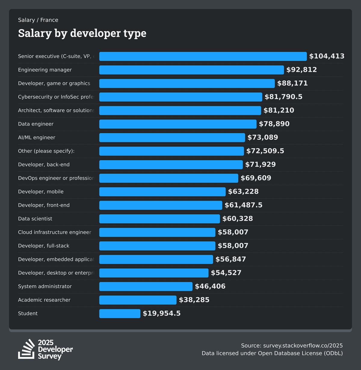 La dernière étude menée par Stack Overflow dévoile les rémunérations des développeurs en 2025 dans de nombreux pays, dont la France.