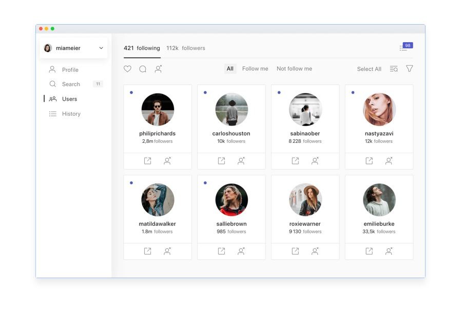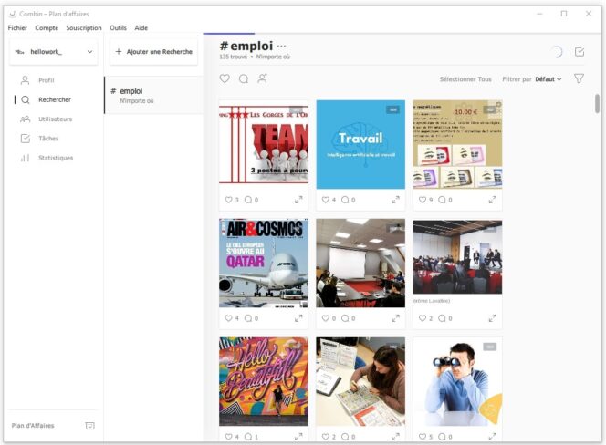 Côté recherche de contenus, et de comptes, là encore Combin se montre très vite indispensable. On peut chercher des contenus ou des comptes sur n’importe quelle thématique et interagir avec eux en masse. La possibilité de sélectionner plusieurs comptes, et de faire tout cela sur desktop, avec le multi-compte est un gain de productivité énorme. Notons que Combin respecte les guidelines Instagram et propose uniquement des actions en accord avec les CGU.