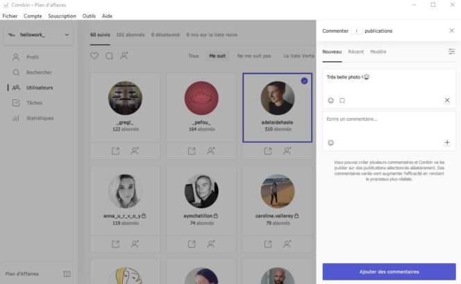 Vous allez notamment pouvoir commenter automatiquement plusieurs comptes, et créer des modèles de commentaires. Vous pourrez sélectionner les comptes à commenter manuellement, ou sélectionner tous les comptes que vous suivez, tous les comptes qui vous suivent, ne vous suivent pas etc. Vous pouvez même créer plusieurs modèles commentaires qui seront utilisés alternativement.