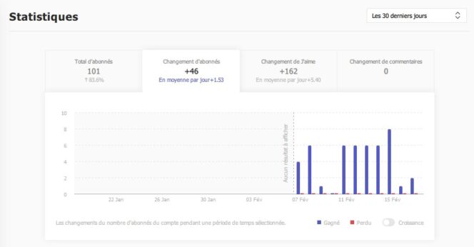 Autre fonctionnalité de Combin pour mesurer ses différentes actions : des statistiques complètes pour chaque compte. Elles permettent notamment de connaître le nombre total d’abonnés, l’évolution des abonnés, le nombre de mentions j’aime, et le nombre de commentaires sur une semaine ou 30 jours.