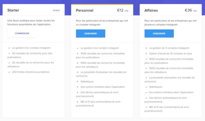 Côté prix, Combin se montre très bon marché. L’offre Starter est gratuite, elle permet la gestion d’un compte, 50 résultats de recherche pour des publications, 25 résultats de recherche pour les utilisateurs et 250 actions journalières. Le compte « Personnel » coûte 12€ TTC par mois et permet la gestion d’un compte, 1000 résultats de recherche, 1000 résultats de recherche d’utilisateurs, les statistiques et les actions illimitées. Le compte « Affaires » coûte 36€ TTC par mois et permet la gestion de 5 comptes Instagram. Idéal donc pour les agences ou les professionnels gérant plusieurs comptes.