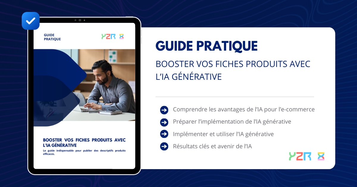 Pour découvrir les autres conseils d’YZR afin de préparer l’implémentation de l’IA pour votre e-commerce, mais également pour tout savoir de la marche à suivre pour l’intégrer et l’utiliser, vous pouvez télécharger gratuitement le guide complet en cliquant sur le lien ci-dessous. Vous profiterez également d’une FAQ précieuse et d’exemples concrets pour tirer le meilleur parti de l’IA générative.