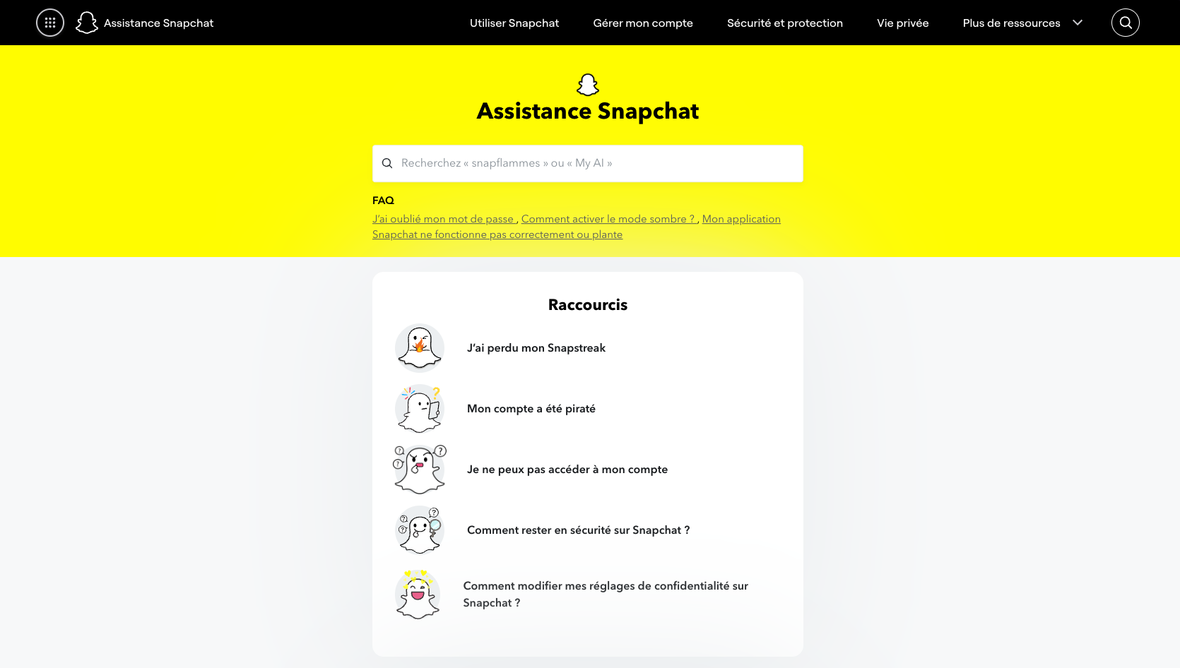 Parmi les réseaux évoqués dans cet article, Snapchat propose sans doute le service d’assistance le plus complet ou, du moins, celui où il est le plus simple de s’y retrouver. Dès la page d’accueil, plusieurs raccourcis permettent d’obtenir de l’aide sur des difficultés rencontrées fréquemment, telles que la perte du Snapstreak, le piratage de compte, l’impossibilité de connexion ou la configuration des réglages de confidentialité.