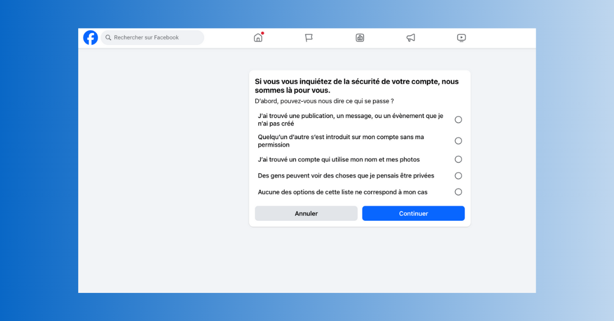 Par ailleurs, pour des incidents liés à la sécurité de votre compte — par exemple, s’il a été piraté ou si votre identité a été usurpée —, le réseau social propose une interface spécifique : Facebook Hacked. Après avoir coché la case correspondant à votre situation et effectué quelques vérifications permettant de confirmer votre identité, vous serez orienté vers la « solution adéquate », détaille Facebook. La plateforme recommande, pour simplifier le processus, d’utiliser « un appareil que vous avez déjà utilisé pour vous connecter ».