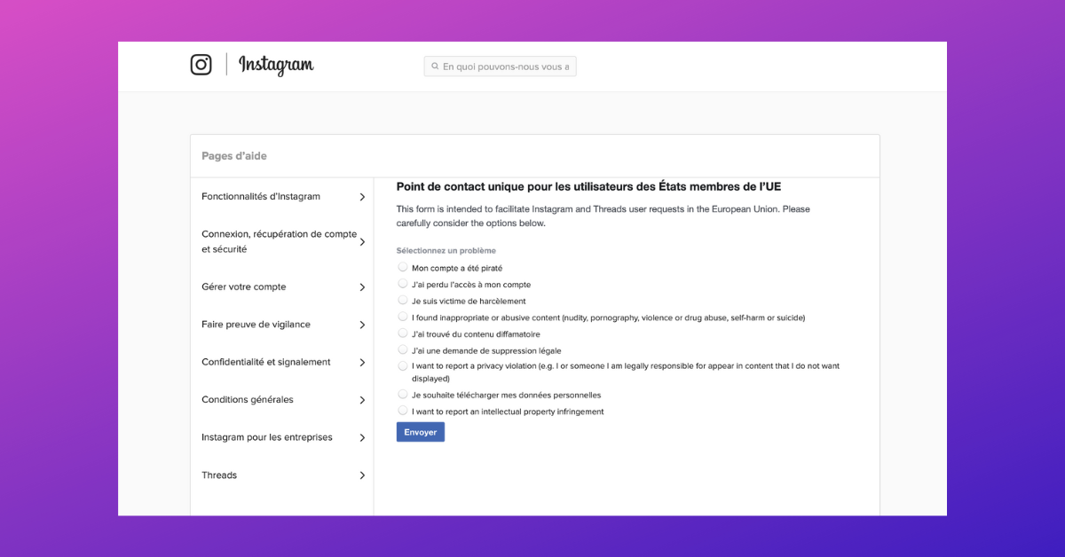 Si vous ne trouvez pas de réponse à votre question, qu’elle porte sur Instagram ou Threads, la plateforme met aussi à disposition un formulaire, disponible à cette adresse, dédié aux situations plus complexes : harcèlement, diffamation, perte d’accès à votre compte, entre autres. Une fois rempli, vous êtes automatiquement redirigé « vers le service d’assistance pertinent et les canaux de contact appropriés », indique Instagram.