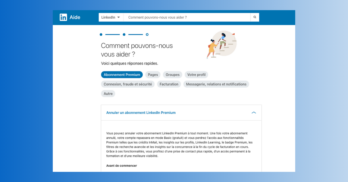 Les abonnés premium sont (un peu) mieux lotis, d’après LinkedIn. Ils peuvent utiliser une messagerie instantanée en cliquant sur Discuter avec l’Assistant depuis la page d’accueil du service d’assistance clientèle, afin de joindre un représentant. « Il n’est possible de discuter en direct qu’en anglais, même si vous utilisez LinkedIn ou l’Assistance clientèle dans une autre langue », précise la plateforme.