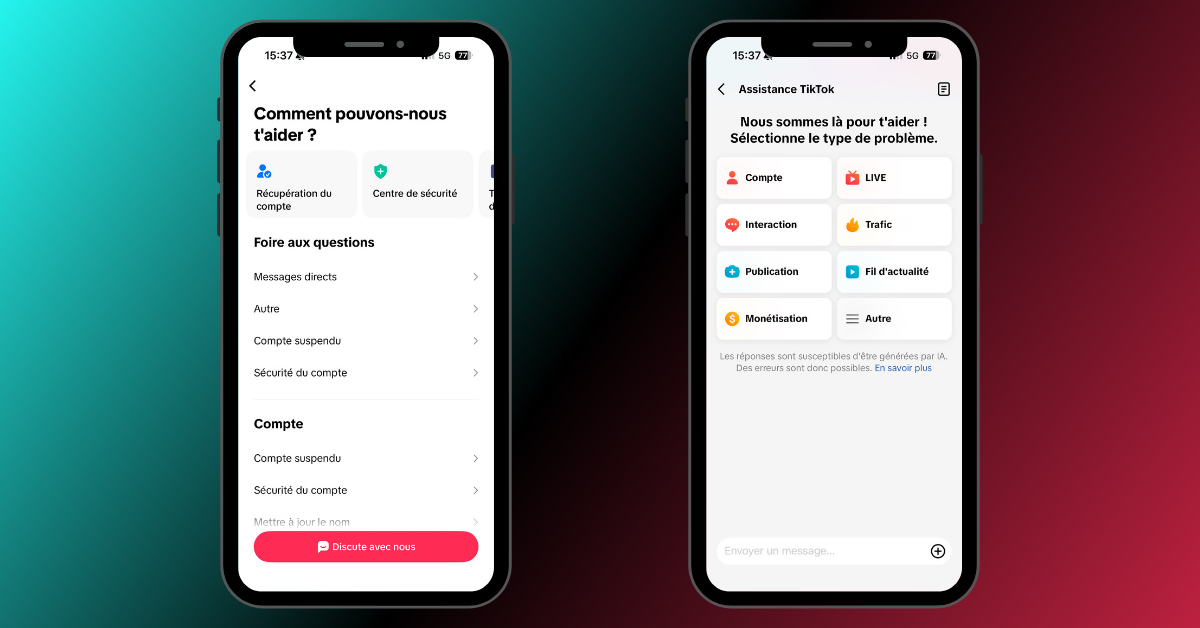 Au sein de cet espace, TikTok donne accès à l’ensemble de la documentation relative aux problèmes de compte (suspension, sécurité, modification du pseudo, etc.) et techniques (impossibilité de publier, de s’abonner, vidéos qui refusent de se lire, etc.). C’est aussi là que vous pouvez soumettre une demande de récupération de compte, consulter le centre de sécurité ou suivre les tickets envoyés au support. TikTok propose également un chat permettant de décrire le problème et d’obtenir de l’assistance automatisée. « Le service d’assistance TikTok utilise l’IA pour générer des réponses standard. Des erreurs sont donc possibles », précise la plateforme.