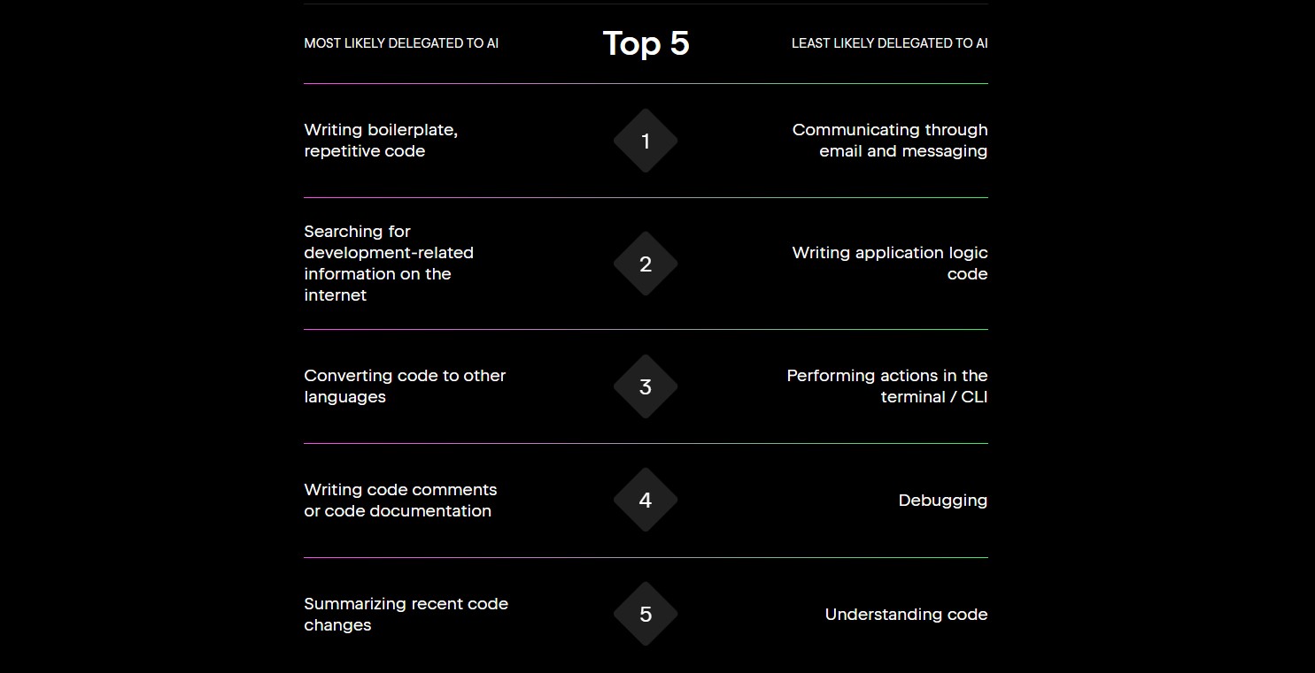 « Les développeurs aimeraient déléguer les tâches routinières à l’IA, mais préfèrent garder le contrôle sur les tâches plus créatives et complexes », explique JetBrains. Ainsi, parmi les tâches sur lesquelles les développeurs préfèrent garder la main, on retrouve la communication par email et messagerie, l’écriture du code logique des applications, les actions dans le terminal/CLI, le débogage et la compréhension du code.