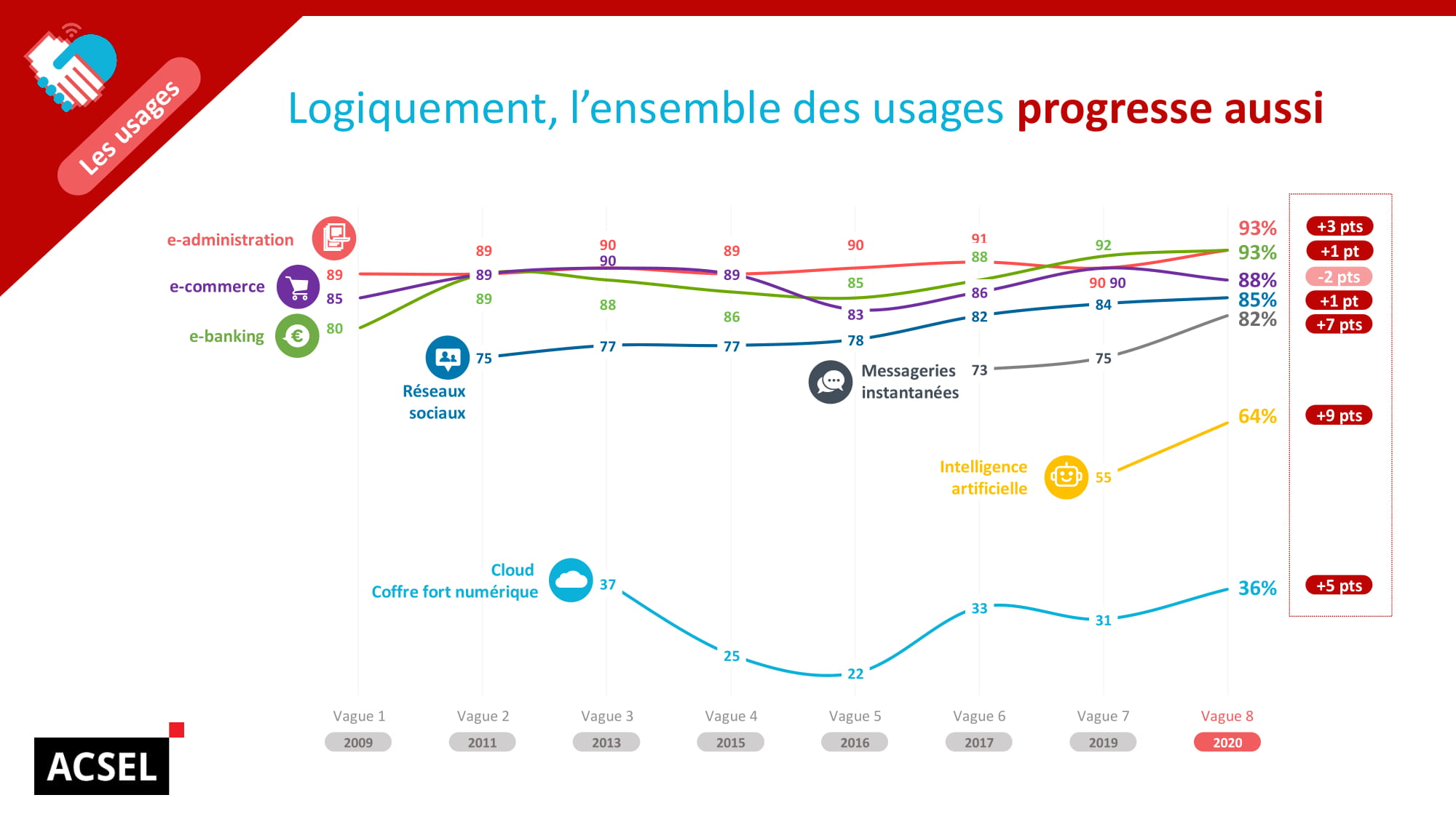 Il est constaté aussi une utilisation accrue des services suivants : e-administration, e-commerce, e-banking, réseaux sociaux, messageries instantanées, IA (Intelligence Artificielle) et Cloud (Coffre fort numérique).