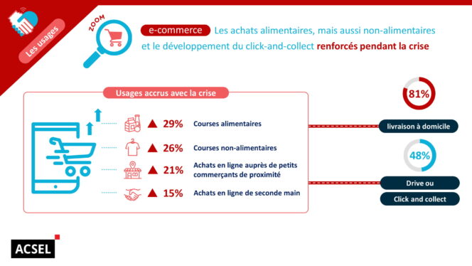Côté e-commerce, on constate une augmentation de la fréquence des achats mais pas du nombre d’e-acheteurs, qui a quant à lui stagné. En effet, 17 % des Français indiquent avoir effectué des achats en ligne chaque semaine durant ces 12 dernier mois (+3 points par rapport à l’an dernier), sur des grandes plateformes comme Amazon ou Wish (83 %) mais aussi sur des sites de petits commerçants (27 %). Les achats alimentaires mais aussi les achats non-alimentaires, par le biais du Click & Collect, se sont accrus pendant la crise.